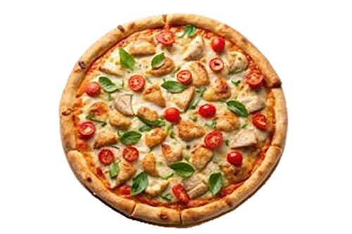 Sauce tomate, poulet curry, poivron, cheddar, oignons.